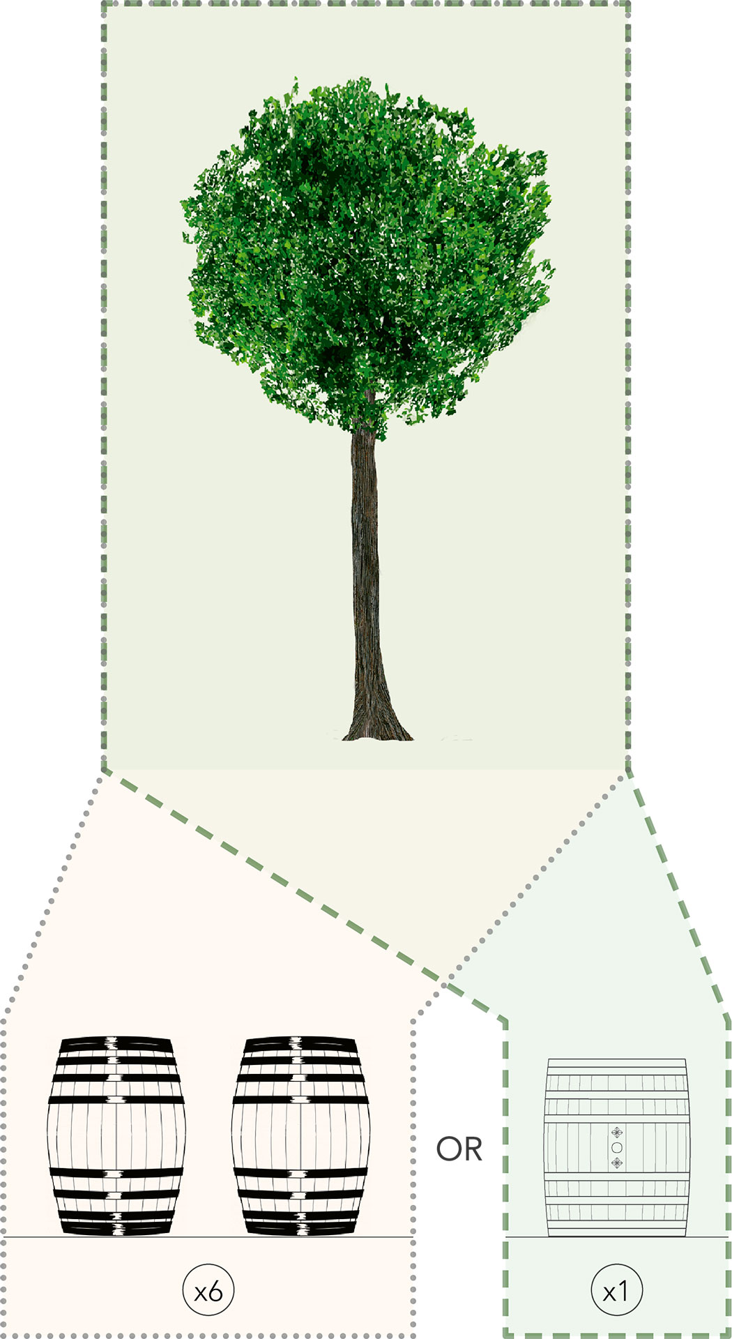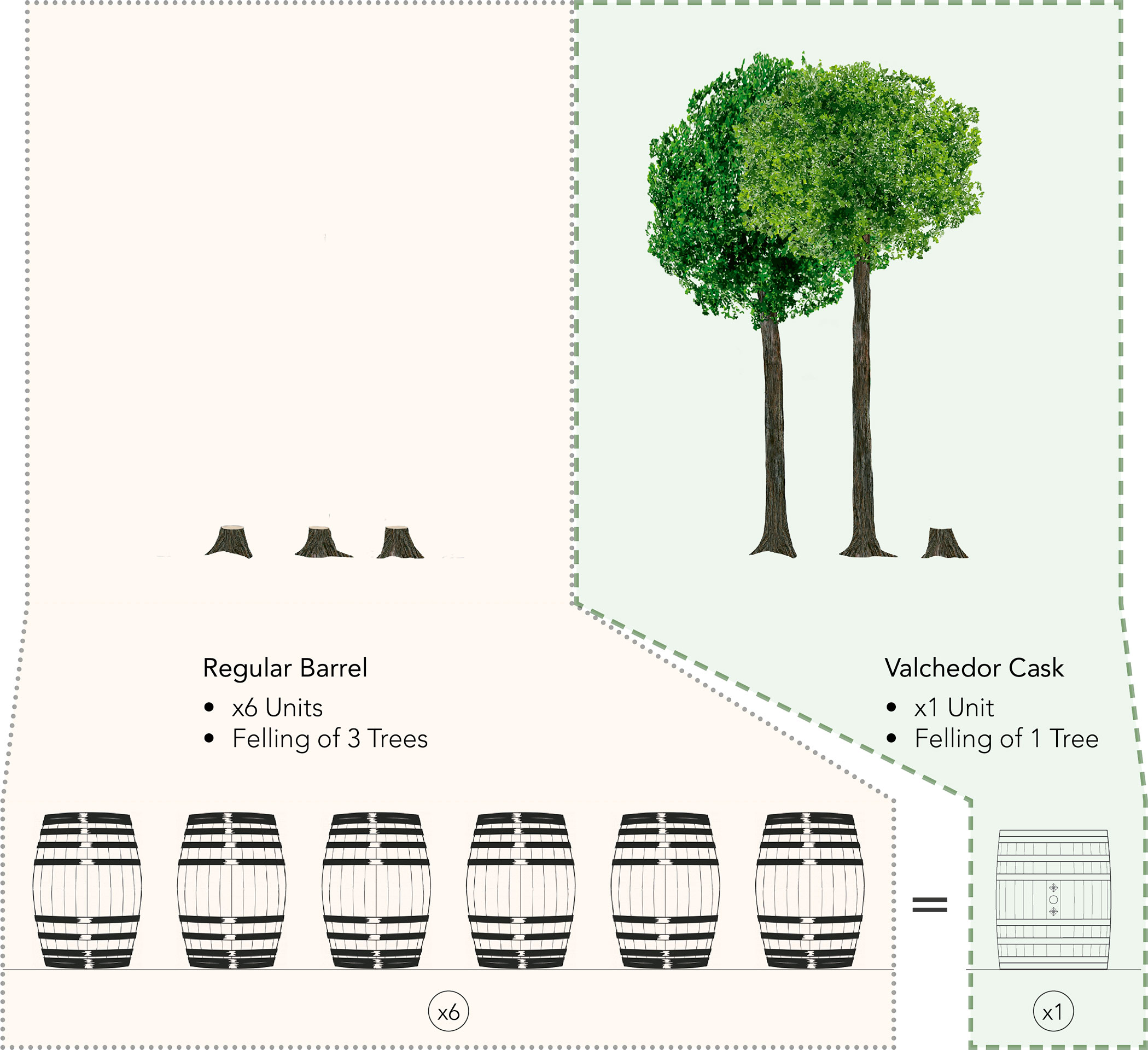 Approximately two barrels are produced for every typical centanary American oak. Below we show why the Valchedor Cask is a much more interesting option in terms of environmental sustainability in comparison to a regular barrel.